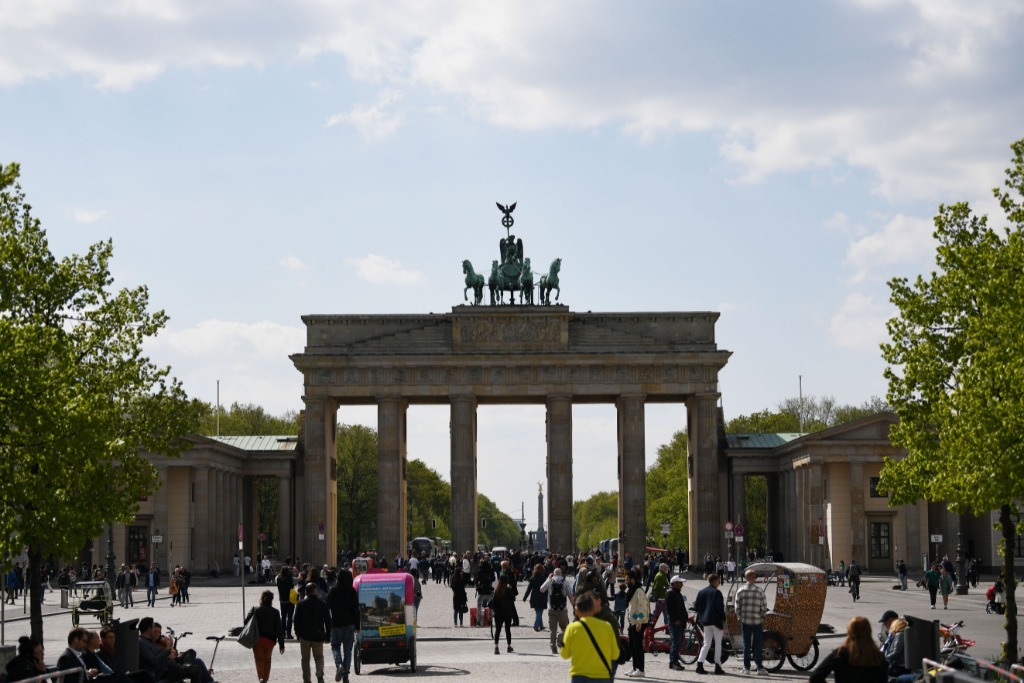 4月28日,游客在德國(guó)柏林勃蘭登堡門(mén)東面的巴黎廣場(chǎng)上游覽。新華社記者任鵬飛攝