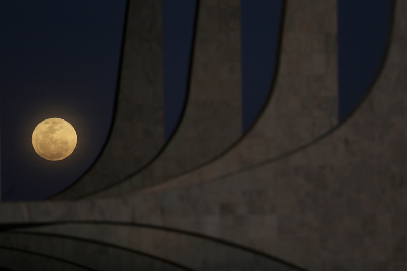 ↑“超級(jí)月亮”現(xiàn)身巴西首都巴西利亞的總統(tǒng)府上空。新華社發(fā)(盧西奧·塔沃拉攝)