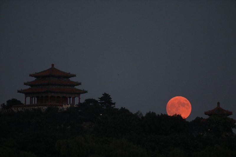 ↑“超級(jí)月亮”現(xiàn)身北京北海公園上空。新華社記者 程婷婷 攝
