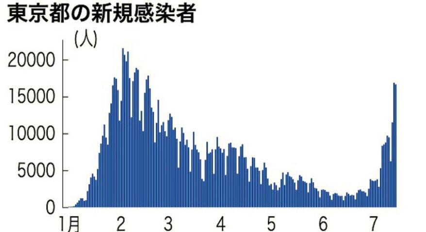 7月14日,東京都新增確診病例1萬6662例,單日新增與上周四相比增加8133例,增長了近1倍,已連續(xù)27天超過前一周同期,并連續(xù)2天超過1萬6000例。截至7月14日,東京都最近一周的日均新增確診病例數(shù)為1萬1322.4例,是前一周的220.8%。