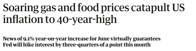 中國(guó)日?qǐng)?bào)網(wǎng)7月15日電 英國(guó)《衛(wèi)報(bào)》網(wǎng)站7月13日?qǐng)?bào)道稱,美國(guó)6月份通貨膨脹增速超出預(yù)期,主要受汽油、食品和住房?jī)r(jià)格上漲影響,通脹率出現(xiàn)40多年來最大的年度增幅。這一消息也基本確定,美聯(lián)儲(chǔ)(Federal Reserve)將在本月再次加息75個(gè)基點(diǎn)。