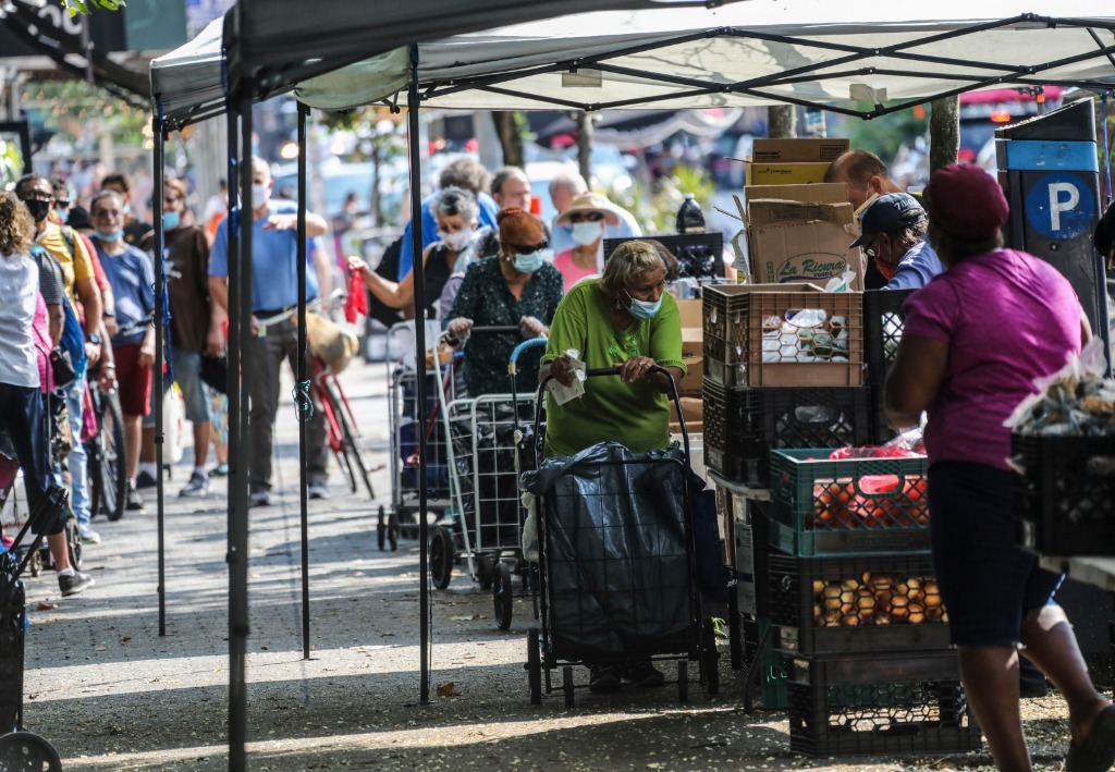 2020年8月8日,人們在美國紐約街頭的免費食物發(fā)放點領取食物。新華社記者王迎攝