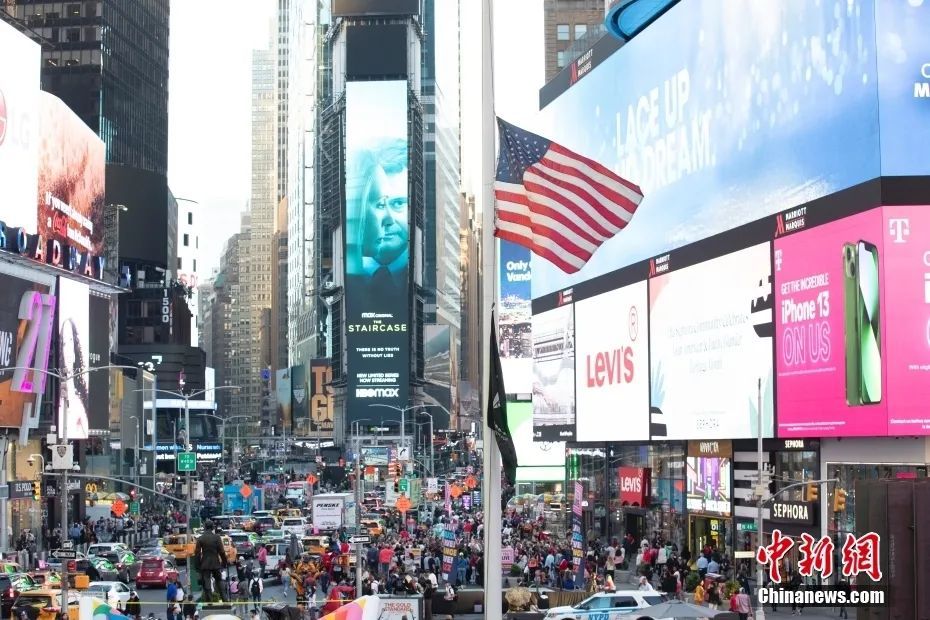當(dāng)?shù)貢r(shí)間2022年5月12日,美國紐約時(shí)報(bào)廣場降半旗致哀百萬新冠逝者。中新社記者 廖攀 攝