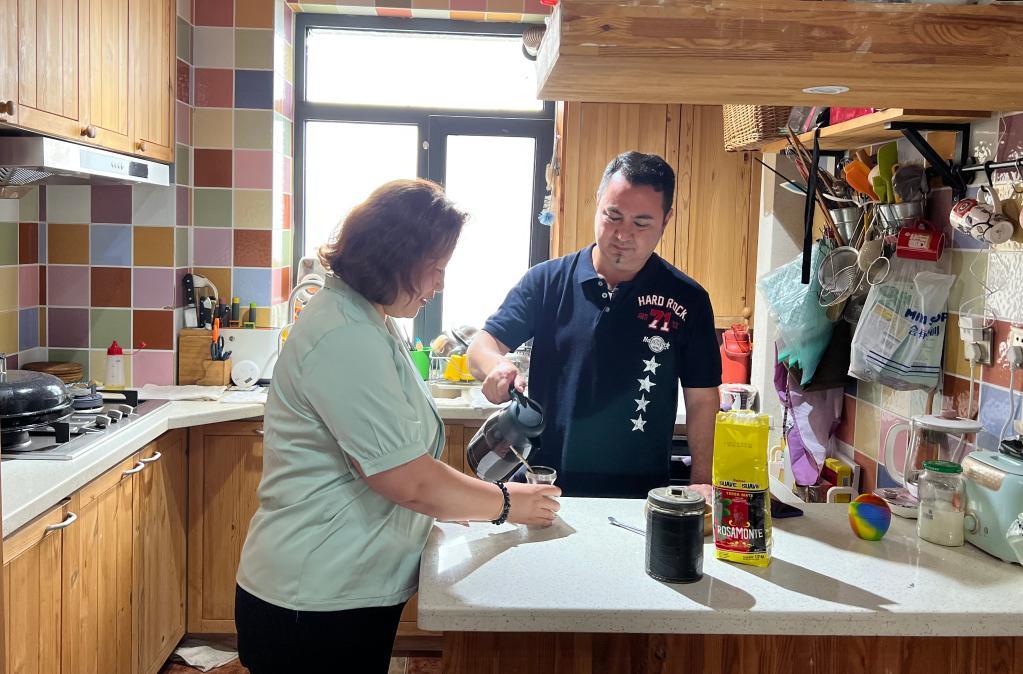 克里斯蒂安·阿卡爾在位于遼寧省大連市甘井子區(qū)的家中和妻子一起準備阿根廷下午茶。新華社記者 趙洪南 攝