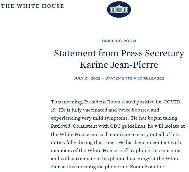 白宮聲明表示,拜登已接種疫苗,目前癥狀輕微,并已經(jīng)開始服藥。他將在白宮進(jìn)行隔離,并在此期間繼續(xù)充分履行職責(zé)。拜登已通過電話與白宮工作人員取得聯(lián)系,并將通過電話和視頻會(huì)議的方式出席原定于今天上午在白宮舉行的會(huì)議。
