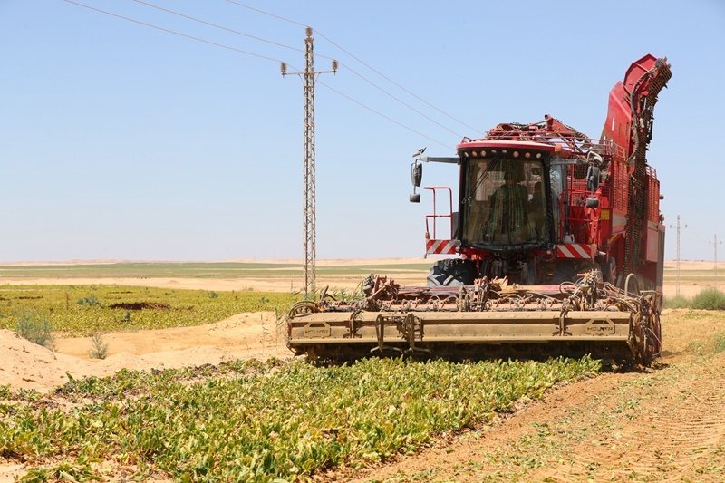↑7月11日,在埃及明亞省沙漠里的甜菜種植農(nóng)場,甜菜收獲機采收成熟的甜菜。新華社記者 隋先凱 攝