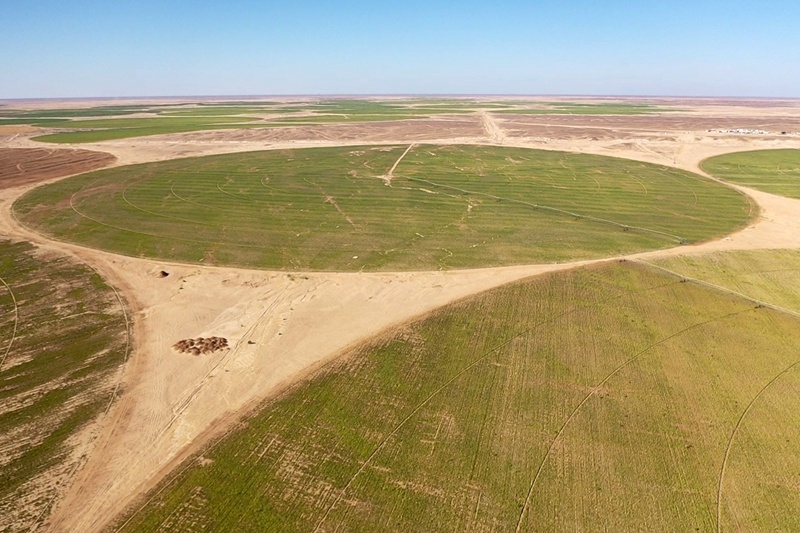 ↑這是7月11日在埃及明亞省沙漠里拍攝的甜菜種植農(nóng)場(無人機照片)。新華社記者 隋先凱 攝