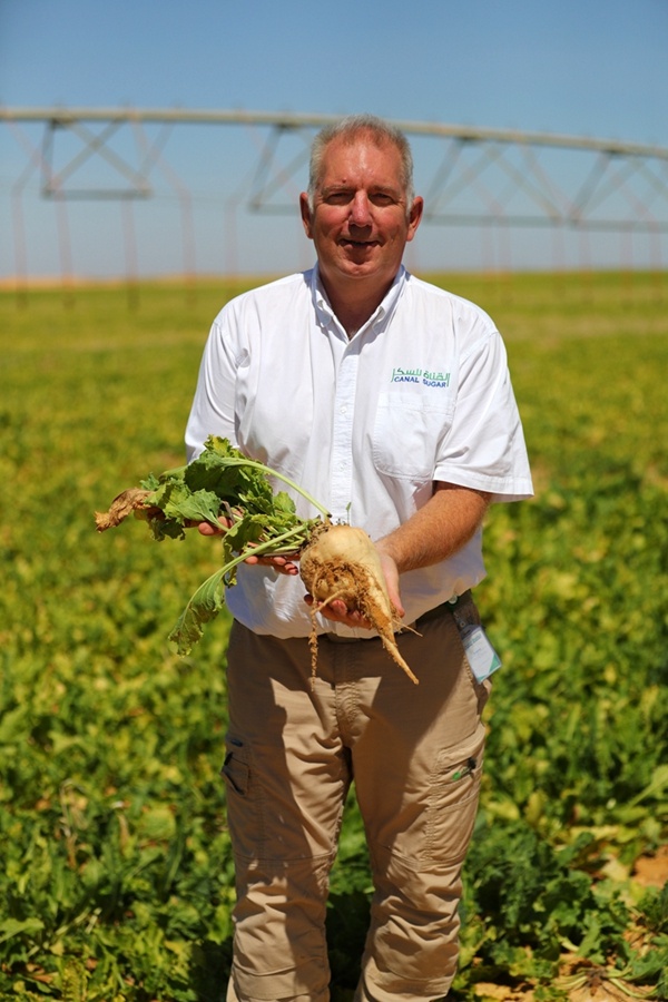↑7月11日,在埃及明亞省沙漠里的甜菜種植農(nóng)場,農(nóng)場負責人鮑德溫手捧甜菜。新華社記者 隋先凱 攝