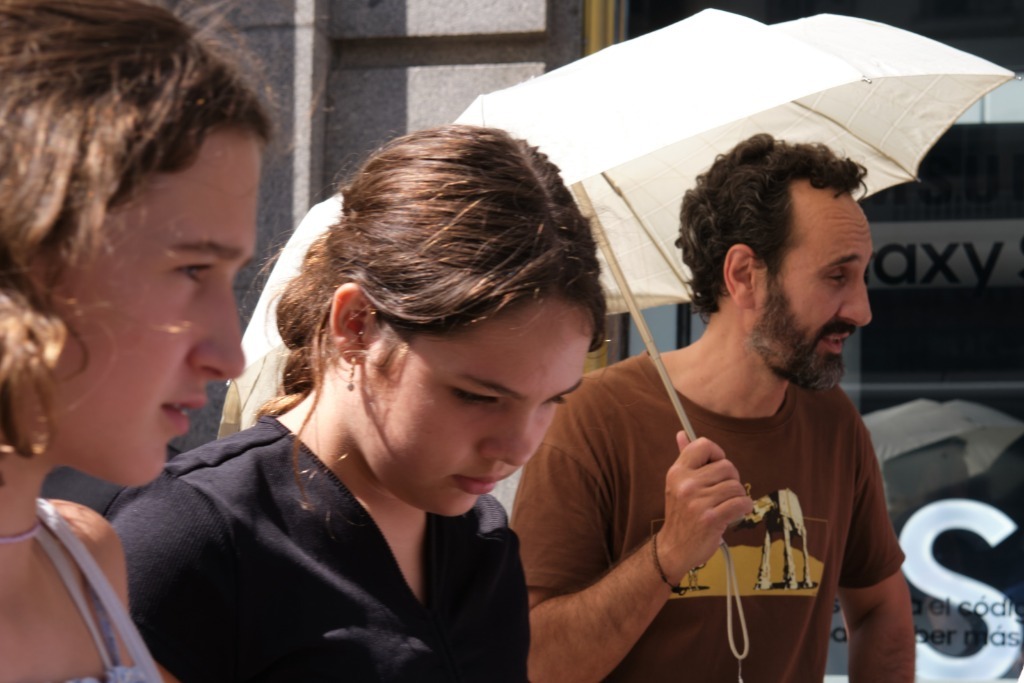 7月20日,一名男子撐傘走在西班牙馬德里街頭。新華社記者孟鼎博攝