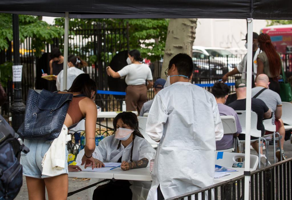 7月14日,人們?cè)诿绹?guó)紐約一處疫苗接種點(diǎn)等待接種猴痘疫苗。新華社發(fā)(郭克攝)