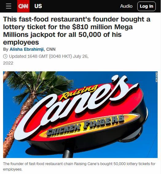 中新網(wǎng)7月27日電 據(jù)美國(guó)有線電視新聞網(wǎng)(CNN)報(bào)道,當(dāng)?shù)貢r(shí)間26日,美國(guó)彩票“超級(jí)百萬(wàn)”(Mega Millions)的頭獎(jiǎng)飆升至8.1億美元,引發(fā)全美各地彩民爭(zhēng)相購(gòu)買(mǎi),快餐連鎖店Raising Cane的創(chuàng)始人格雷夫斯(Todd Graves)也是其中之一。