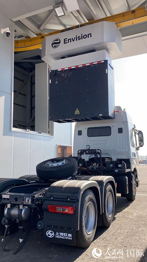 遠景零碳產(chǎn)業(yè)園內(nèi)的換電重卡項目。人民網(wǎng)記者 吳思萱攝