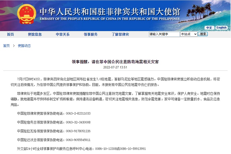 人民網(wǎng)訊 據(jù)中國(guó)駐菲律賓大使館網(wǎng)站消息,7月27日8時(shí)43分,菲律賓呂宋島北部地區(qū)阿布拉省發(fā)生7.0級(jí)地震,首都馬尼拉等地區(qū)震感強(qiáng)烈。中國(guó)駐菲律賓使館立即啟動(dòng)應(yīng)急機(jī)制,將密切關(guān)注后續(xù)情況,為在菲中國(guó)公民提供領(lǐng)事保護(hù)和協(xié)助。目前,未接到有中國(guó)公民在地震中傷亡的報(bào)告。
