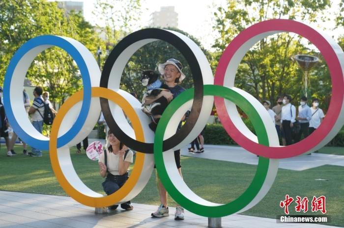 資料圖:日本東京國(guó)立競(jìng)技體育場(chǎng)外,日本民眾排隊(duì)與五環(huán)合影。 中新社記者 韓海丹 攝