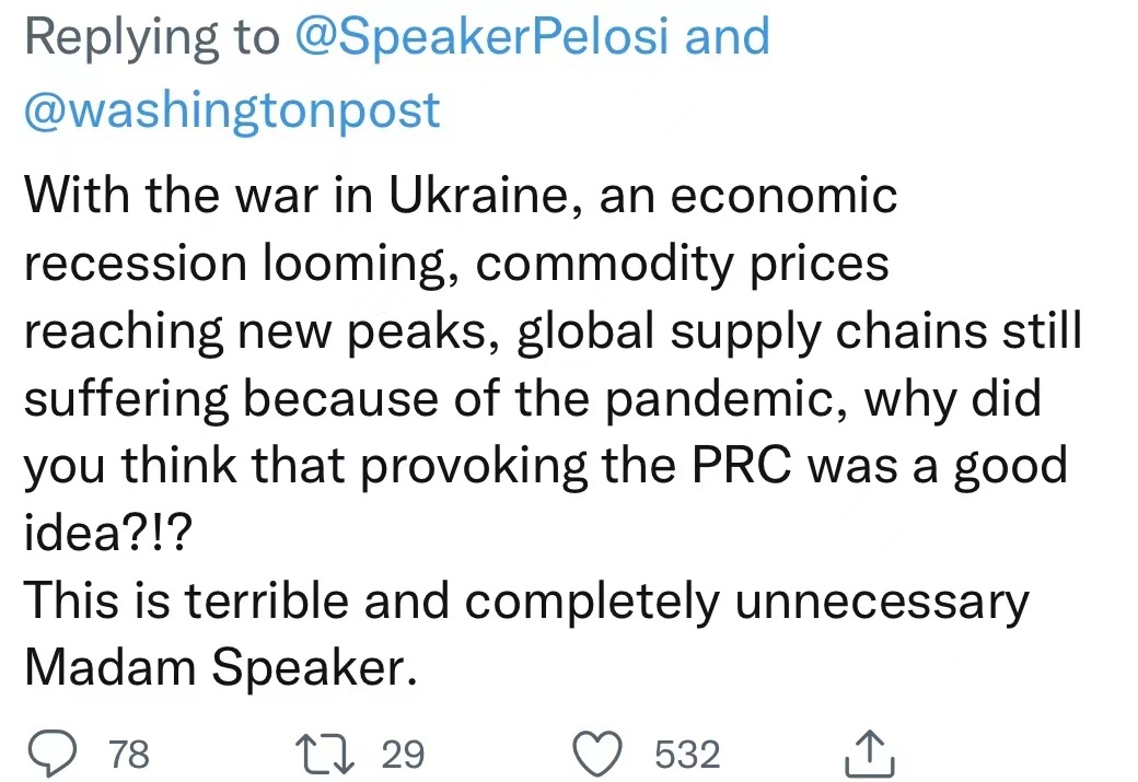 “隨著烏克蘭戰(zhàn)爭進(jìn)行,經(jīng)濟(jì)衰退迫在眉睫,商品價格達(dá)到新高,全球供應(yīng)鏈仍在疫情影響下遭受損失,為什么你會覺得挑釁中國是個好主意?這真是太糟糕了,也完全沒必要?!?/p>