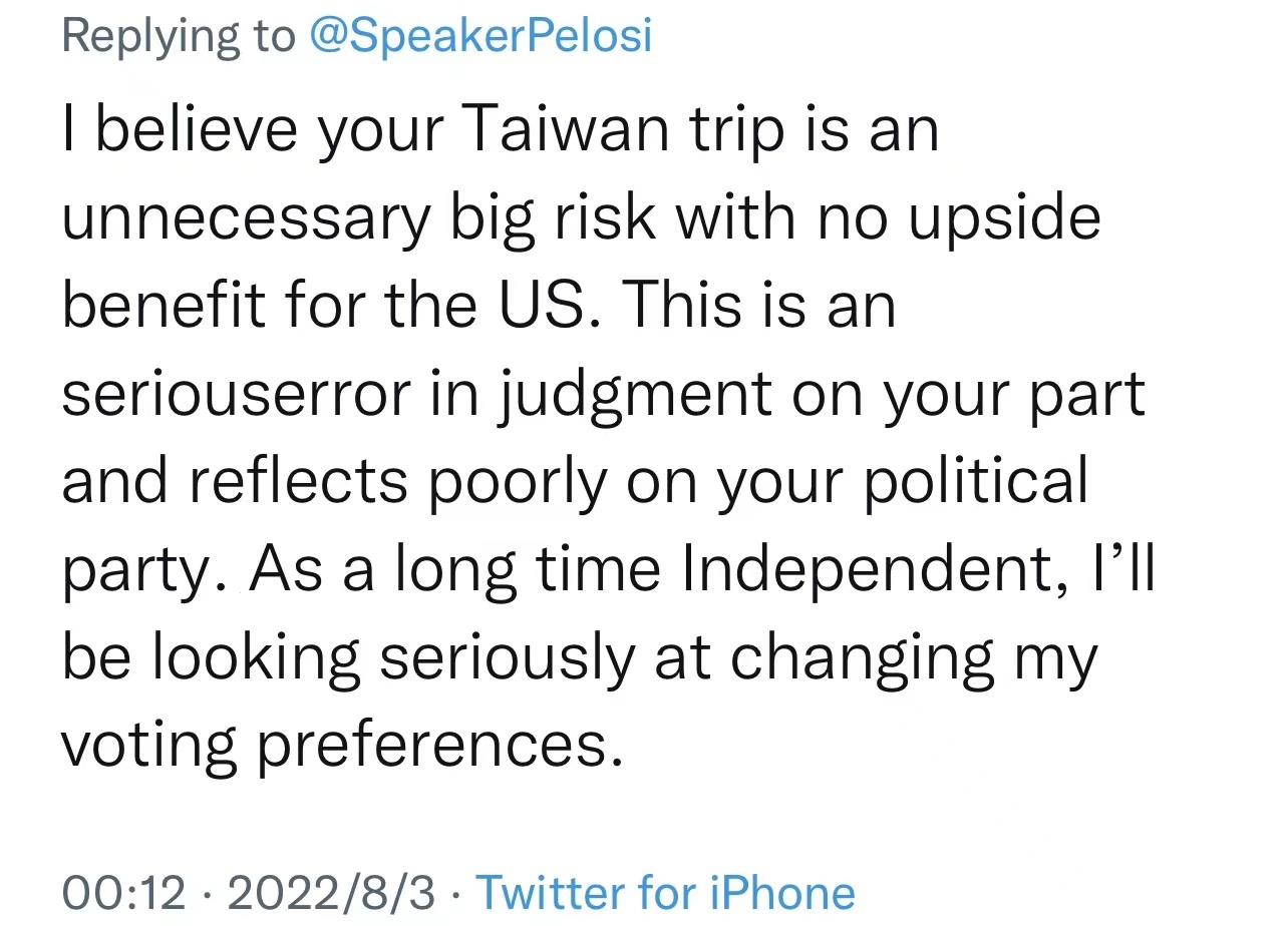 “我認(rèn)為你的臺灣之行是不必要的大冒險,對美國沒有任何好處。這是你的嚴(yán)重錯誤判斷,對你的政黨影響很差?!?/p>
