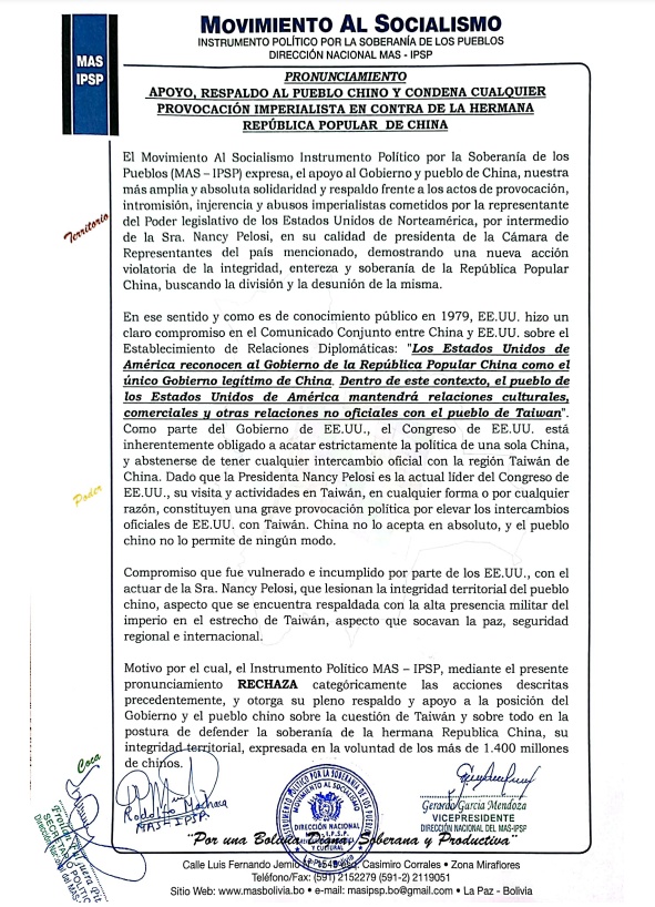 針對(duì)美國(guó)立法機(jī)構(gòu)領(lǐng)導(dǎo)人、眾議長(zhǎng)佩洛西近日通過(guò)挑釁、干涉、侵犯中華人民共和國(guó)主權(quán)和領(lǐng)土完整,旨在制造中國(guó)內(nèi)部分裂和矛盾的帝國(guó)主義暴行,玻利維亞“爭(zhēng)取社會(huì)主義運(yùn)動(dòng)”黨向中國(guó)政府和人民表達(dá)我們的廣泛聲援和絕對(duì)支持。