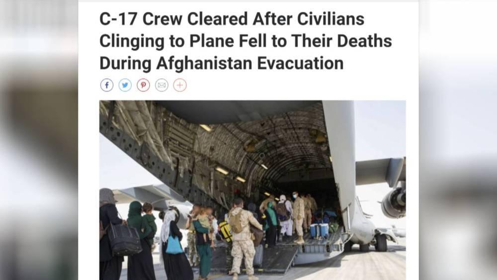 2021年8月16日,兩名阿富汗平民在喀布爾國(guó)際機(jī)場(chǎng)從美軍撤離的軍機(jī)上不幸跌落遇難。美軍方后來(lái)宣布該機(jī)組人員“沒(méi)有任何過(guò)錯(cuò)”。