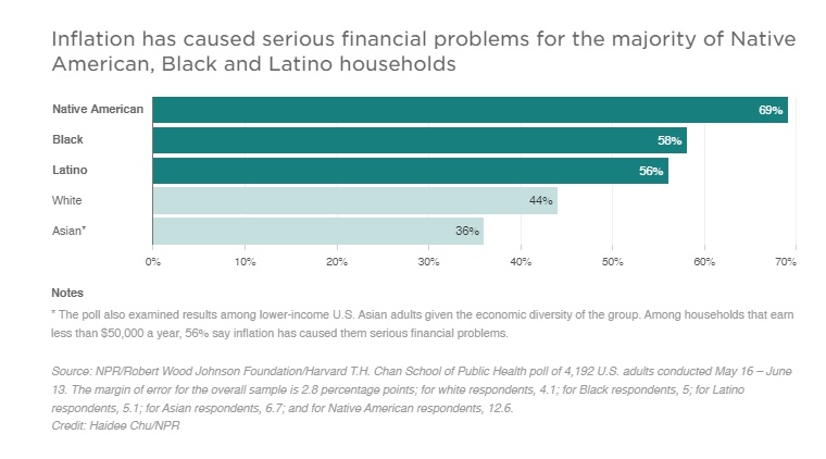 中國日?qǐng)?bào)網(wǎng)8月17日電 哈佛大學(xué)陳曾熙公共衛(wèi)生學(xué)院日前在其官網(wǎng)發(fā)布了與美國國家公共電臺(tái)(NPR)及羅伯特·伍德·約翰遜基金會(huì)(Robert Wood Johnson Foundation)聯(lián)合進(jìn)行的一項(xiàng)最新民調(diào)結(jié)果。結(jié)果顯示,在美國各地的家庭廣泛報(bào)告通貨膨脹導(dǎo)致嚴(yán)重問題之際,與白人群體相比,美國少數(shù)族裔在生活的一些關(guān)鍵領(lǐng)域處境艱難,尤其是在財(cái)務(wù)、可負(fù)擔(dān)住房、社區(qū)安全、教育和醫(yī)療保健方面,他們更有可能在這此期間面臨嚴(yán)重財(cái)務(wù)問題。該民調(diào)覆蓋了全美4192名18歲及以上的成年人,包括白人,黑人,拉丁裔,亞洲人及原住民群體。