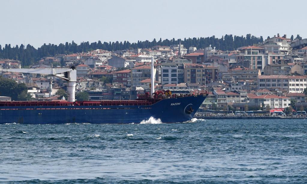 8月3日,從烏克蘭敖德薩港出發(fā)的首艘運(yùn)糧船“拉佐尼”號經(jīng)過位于土耳其伊斯坦布爾的博斯普魯斯海峽。新華社記者沙達(dá)提攝