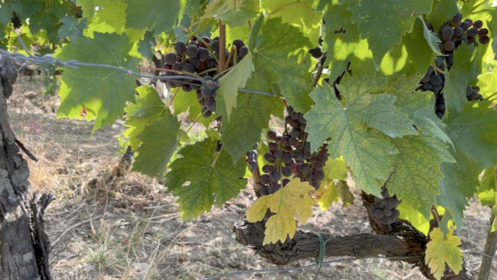這座農(nóng)場主要種植葡萄、油橄欖和當(dāng)季蔬菜等作物,同時生產(chǎn)葡萄酒和橄欖油等農(nóng)產(chǎn)品。走進烈日炙烤下的葡萄園,這里的土壤呈淺黃色,一些地方甚至已經(jīng)開裂,不少葡萄果實的表皮長出了“皺紋”,汁水難以稱得上充足。