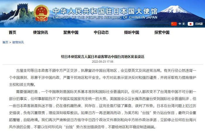 中新網(wǎng)8月23日電 據(jù)中國駐日本使館網(wǎng)站23日消息,23日,中國駐日本使館發(fā)言人就日本政客竄訪中國臺灣地區(qū)發(fā)表談話。