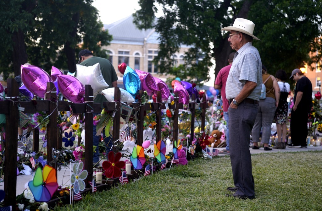 5月30日,在美國得克薩斯州南部尤瓦爾迪市的城市廣場,人們悼念槍擊事件遇害者。新華社記者吳曉凌攝