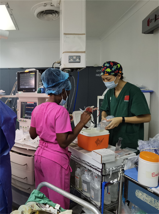 中國醫(yī)療隊(duì)醫(yī)生卜曉萱(右)指導(dǎo)手術(shù)麻醉。中國17期援圭亞那醫(yī)療隊(duì)供圖 |