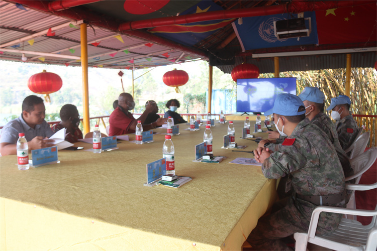我維和官兵向聯(lián)合國(guó)核查人員介紹裝備資料。中國(guó)第25批赴剛果(金)維和工兵分隊(duì)供圖 |