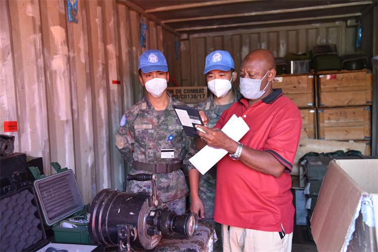 聯(lián)合國(guó)裝備核查人員對(duì)軍械器材進(jìn)行拍照留存。中國(guó)第25批赴剛果(金)維和工兵分隊(duì)供圖 |