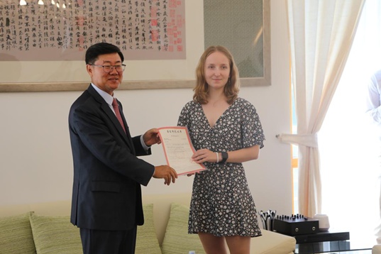 中國(guó)駐斯洛伐克大使孫立杰詳細(xì)詢問(wèn)了同學(xué)們的漢語(yǔ)學(xué)習(xí)情況,并向兩名斯洛伐克學(xué)生發(fā)放了中國(guó)兩所大學(xué)的錄取通知書。