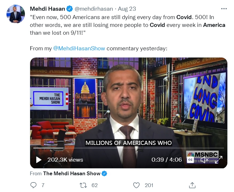 美國(guó)著名主持人梅迪·哈桑(Mehdi Hasan)日前在海外社媒平臺(tái)推特(Twitter)發(fā)布了一段自己的電視評(píng)論節(jié)目視頻(視頻由美國(guó)微軟-全國(guó)廣播公司制作播出)并配文: