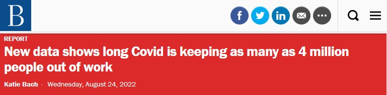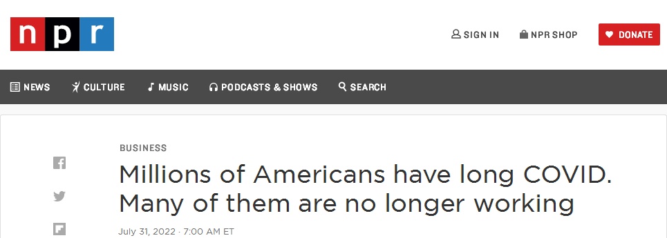 美國(guó)全國(guó)公共廣播電臺(tái)(NPR)7月底曾發(fā)表題為《數(shù)百萬(wàn)美國(guó)人留有新冠后遺癥 其中大部分人已無(wú)法工作》的評(píng)論文章,文章援引美國(guó)布魯金斯學(xué)會(huì)高級(jí)研究員凱蒂·巴赫(Katie Bach)的話(huà)稱(chēng),保守估計(jì)有400萬(wàn)全職員工因新冠后遺癥而失業(yè),高達(dá)美國(guó)工作人口的 2.4%,是一個(gè)“令人震驚的數(shù)字”。