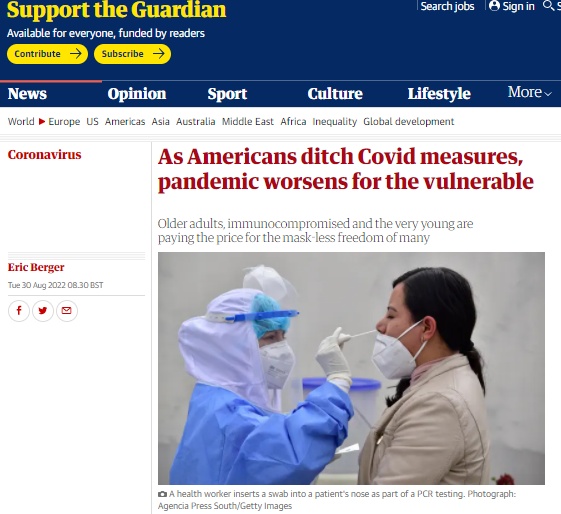 美國(guó)《紐約時(shí)報(bào)》7月底也曾發(fā)表報(bào)道披露,近期美國(guó)新冠肺炎病例激增,疫情導(dǎo)致的死亡人數(shù)居高不下,而美國(guó)民眾新冠疫苗加強(qiáng)針的接種率僅為50%左右,“口罩令”難以重啟。報(bào)道強(qiáng)調(diào),BA.5毒株的肆虐或?qū)⒔o美國(guó)提個(gè)醒,在完全被新冠控制生活與“躺平”放任之間還有折中的選擇。
