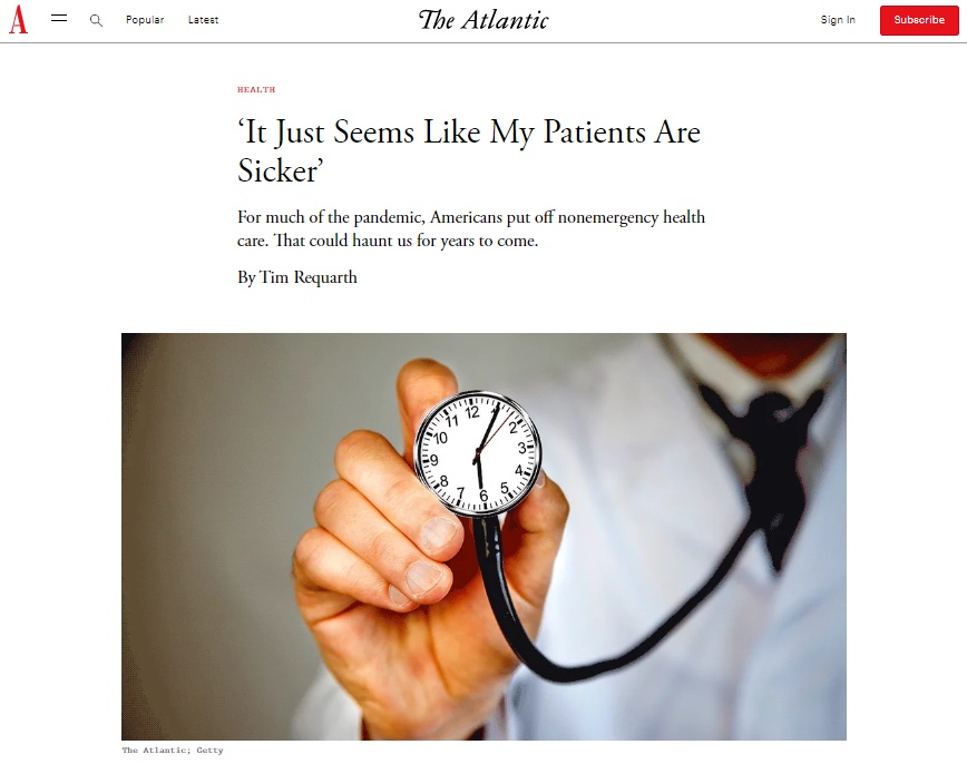美國(guó)《大西洋月刊》網(wǎng)站8月29日發(fā)表的文章提到一位并未感染過(guò)新冠肺炎的癌癥病人的故事。該病患經(jīng)過(guò)手術(shù)治療恢復(fù)情況很好,但需要定期復(fù)查,然而由于擔(dān)心去醫(yī)院復(fù)查感染新冠的風(fēng)險(xiǎn)太高,他便一再選擇推遲復(fù)查?!爱?dāng)我再次見(jiàn)到他時(shí),他已需要臨終關(guān)懷,不久后便去世了?!眱?nèi)科醫(yī)生勞拉(Laura)稱(chēng)這是她最難以釋?xiě)训氖?。“他原本可以好好活下去的。?/p>