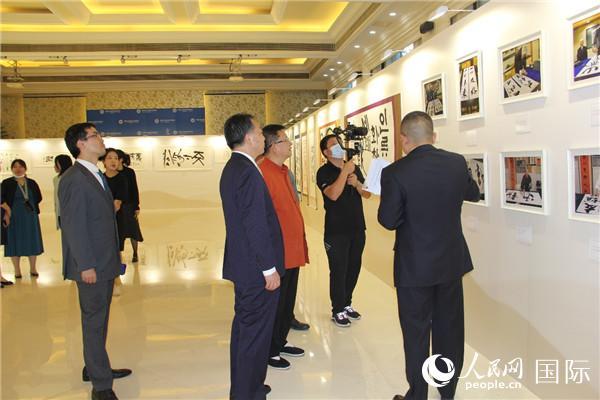 日中文化交流委員會常任委員中村云龍?jiān)谝曨l連線中展示了作品,并表示日本的歷史和文化與中國淵源深厚。希望通過書法這一三國共通的文化元素推動日中韓三國和平友好、共同發(fā)展。