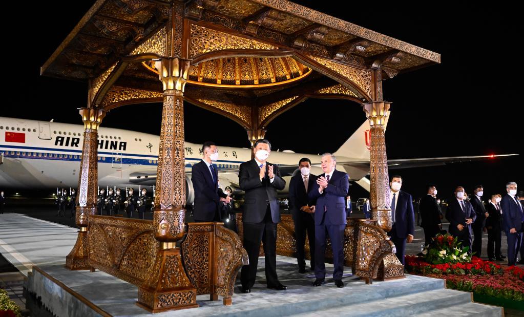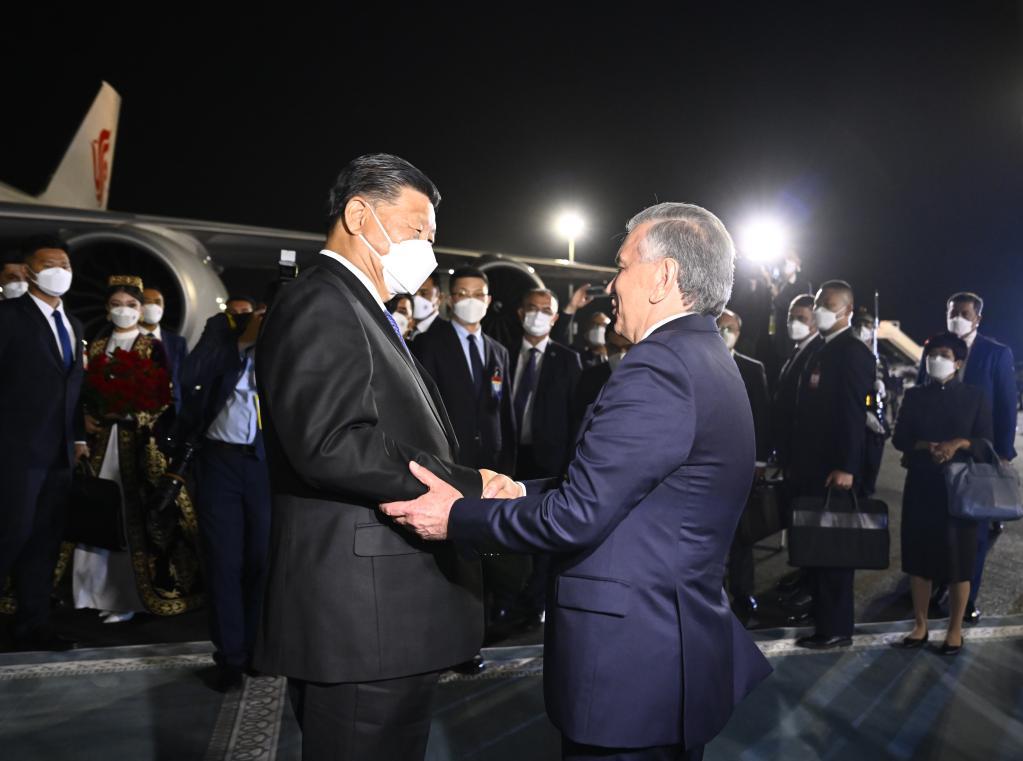 當(dāng)?shù)貢r(shí)間9月14日晚,國家主席習(xí)近平乘專機(jī)抵達(dá)撒馬爾罕,開始對(duì)烏茲別克斯坦共和國進(jìn)行國事訪問并出席上海合作組織成員國元首理事會(huì)第二十二次會(huì)議。這是烏茲別克斯坦總統(tǒng)米爾濟(jì)約耶夫、政府總理阿里波夫、外長諾羅夫、撒馬爾罕州州長圖爾濟(jì)莫夫等高級(jí)官員在機(jī)場熱情迎接。新華社記者 李學(xué)仁 攝