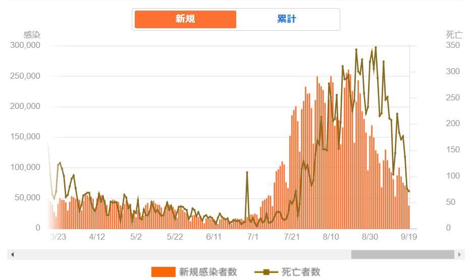 人民網(wǎng)東京9月20日電 綜合日媒報(bào)道,9月19日,日本全國新增新冠肺炎確診病例3萬8057例,單日新增時(shí)隔兩個(gè)多月再次降至4萬例以下。當(dāng)日新增死亡病例72例,現(xiàn)有重癥病例300例。