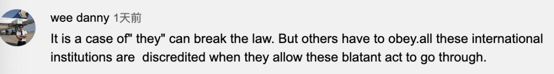 英語網(wǎng)友wee danny:“這又是一個雙標(biāo)案例?!承﹪摇梢赃`反,但其他人必須服從。所有允許這種明目張膽的雙標(biāo)行為的國際機構(gòu),都將名譽掃地?!?/p>