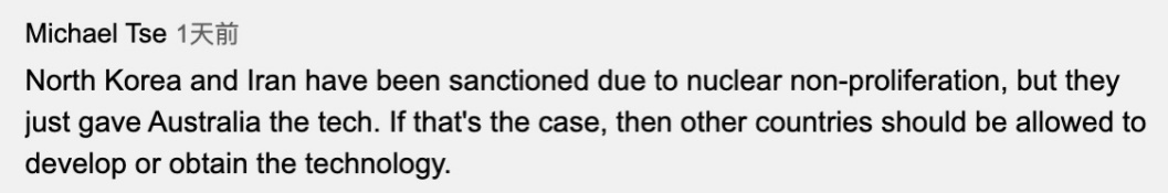 英語網(wǎng)友Michael Tse:“朝鮮和伊朗因不擴散核武器條約而受到制裁,但美國和英國把技術(shù)給了澳大利亞。如果可以這么做的話,那么其他國家應(yīng)該被允許開發(fā)或獲得核技術(shù)。”