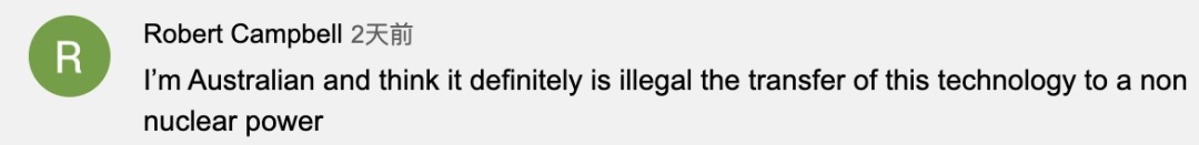 澳大利亞網(wǎng)友Robert Campbell表示:“我是澳大利亞人。我認(rèn)為將這個技術(shù)轉(zhuǎn)讓給一個無核國家絕對是不合法的?!?/p>