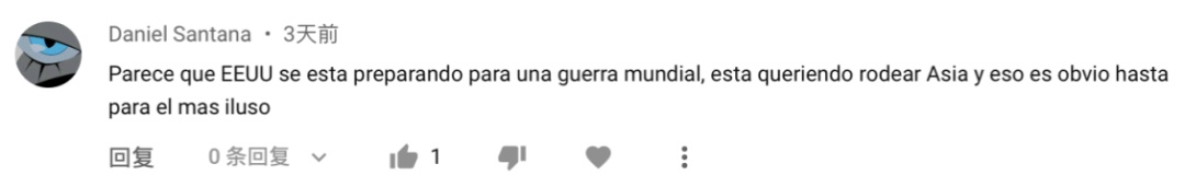 西班牙語網(wǎng)友丹尼爾:“美國正在籌備一場世界大戰(zhàn),企圖圍堵亞洲,這已是昭然若揭?!?/p>