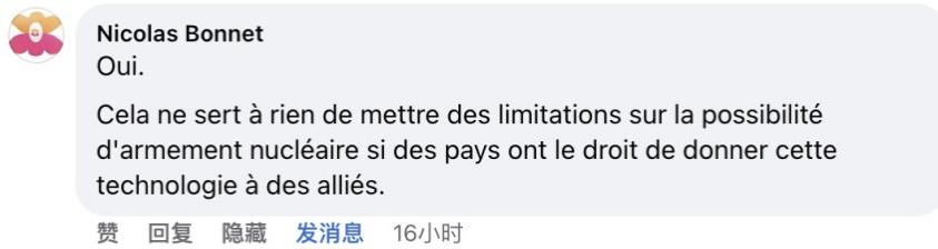法語網(wǎng)友Nicolas Bonnet:“是的。如果各國有權(quán)將這種技術(shù)提供給盟友,那么限制核武器是沒有意義的?!?/p>