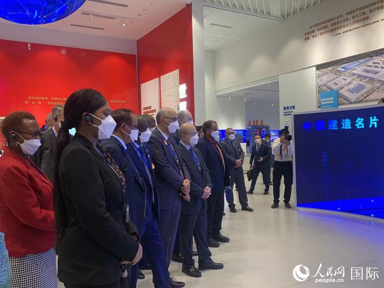 駐華使節(jié)們在中建“中國建造之路”展廳參觀。人民網(wǎng)記者 韓碩 攝 |