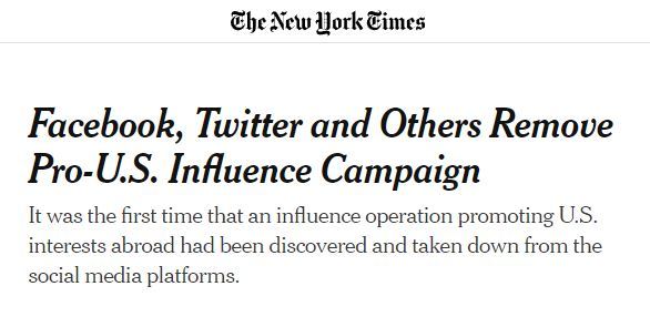 為傳播虛假信息,美國還制定了“影響力行動”等一系列戰(zhàn)略建立造謠網(wǎng)絡。斯坦福大學研究報告顯示,2022年7月和8月,臉書、推特等社交媒體“首次發(fā)現(xiàn)并清除面向海外推動美國利益的‘影響力行動’”,臉書母公司Meta稱發(fā)現(xiàn)有賬戶“協(xié)調(diào)一致”發(fā)布虛假信息。這些賬號在社交媒體平臺宣揚親西方的言論,并詆毀中國等國家。報告發(fā)布后,《華盛頓郵報》報道稱,美國國防部迫于壓力,不得不宣布將對美軍實施秘密信息戰(zhàn)的方式進行審查。