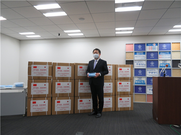 2020年山梨縣知事長崎幸太郎佩戴著四川省捐贈的口罩。山梨縣供圖