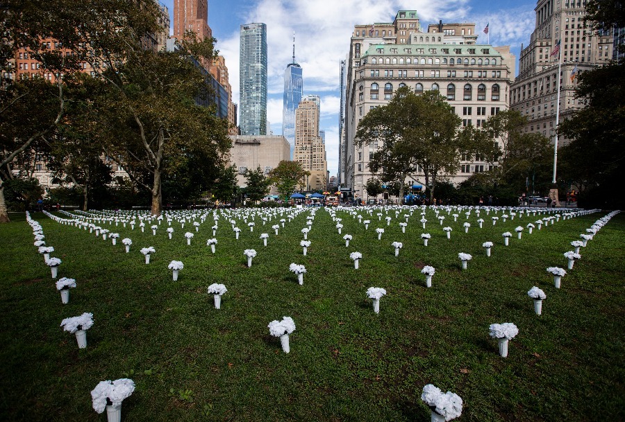 這是2021年10月8日在美國紐約炮臺公園內(nèi)拍攝的為悼念槍支暴力遇難者擺放的白色瓶花。新華社記者 王迎攝