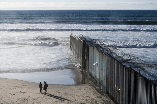 2019年1月10日,在墨西哥邊境城市蒂華納,游客在美墨邊境墻邊交談。新華社記者 辛悅衛(wèi)攝