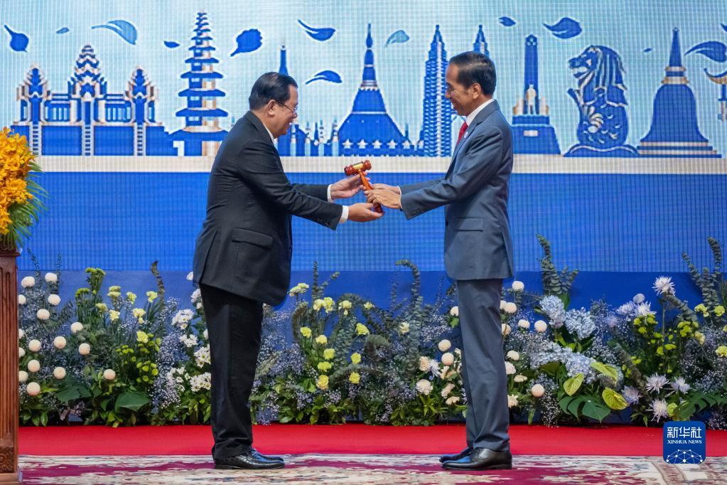 11月13日,在柬埔寨首都金邊,柬埔寨首相洪森(左)將東盟輪值主席木槌移交給2023年東盟輪值主席國印度尼西亞總統(tǒng)佐科。新華社記者 朱煒攝