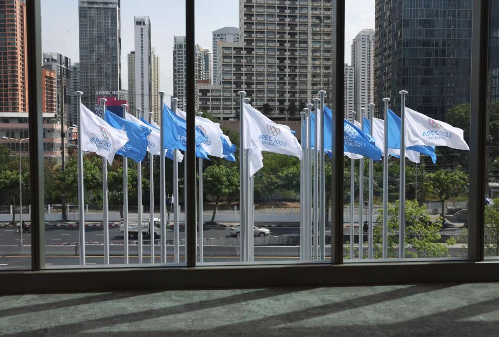 曼谷商業(yè)區(qū)的詩麗吉王后國家會(huì)議中心是亞太經(jīng)合組織第二十九次領(lǐng)導(dǎo)人非正式會(huì)議主會(huì)場,藍(lán)、紅、綠三色標(biāo)語格外醒目,組成這次會(huì)議的主題“開放、聯(lián)通、平衡”。
